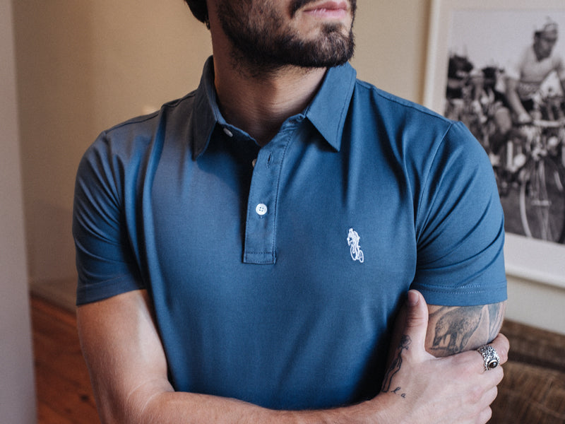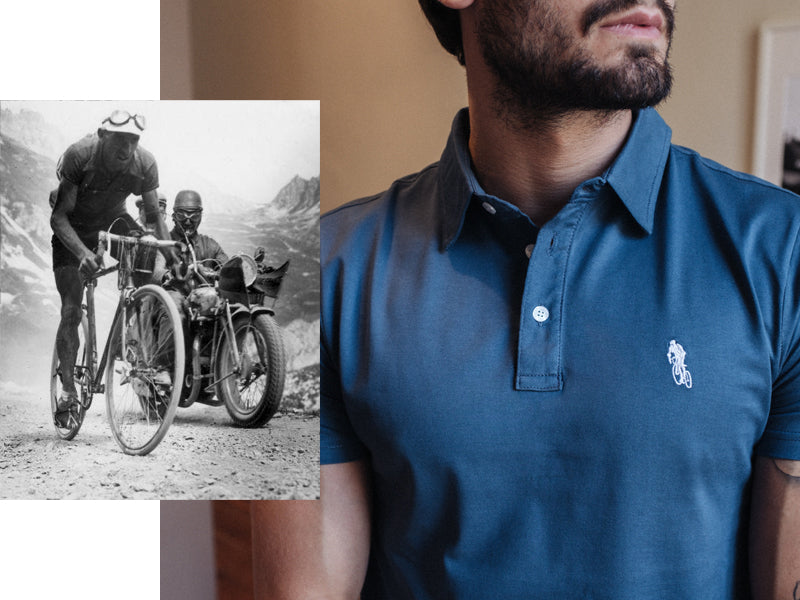 Le polo EMBLÈME s’inspire des vieux maillots de cyclisme et du mythe du Grimpeur: Palmarès en a fait son emblème pour honorer les pionniers de 1920 qui avec leurs lourds vélos, sur des routes non goudronnées ont accompli d’authentiques exploits dans les cols mythiques du Tour de France : Tourmalet, Izoard, Galibier.