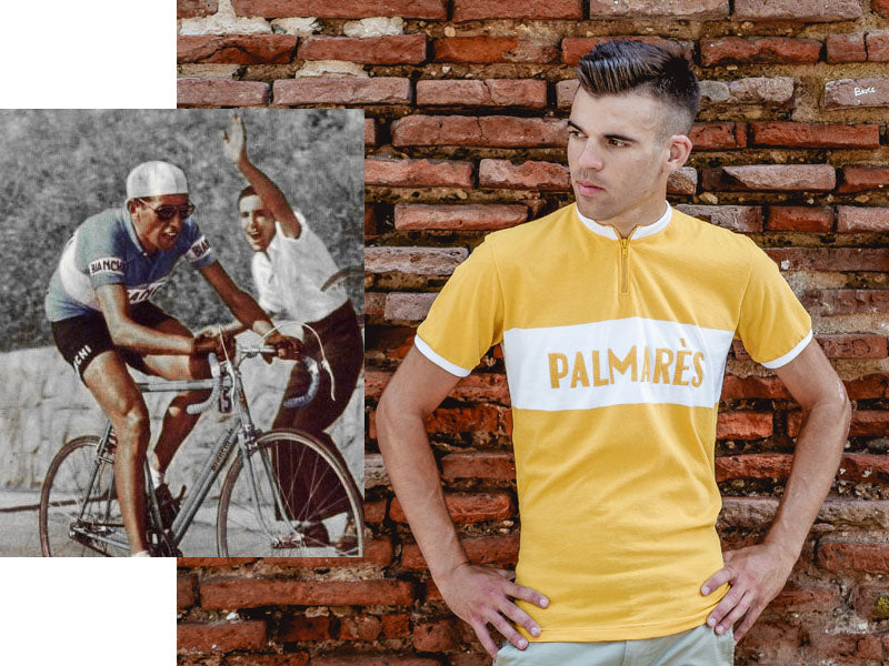 Dès 1945, Fausto COPPI arbora le mythique maillot BIANCHI pendant plus de 10 ans et a inspiré Palmarès pour créer LE FAUSTO JAUNE : ce célèbre maillot BIANCHI bleu ciel avec une large bande blanche sur la poitrine ou était imprimé le nom du sponsor (la célèbre marque italienne de vélo BIANCHI) présentait un col rond bord cote une et une, doté d’une fermeture éclair et des bords cotes une et une bicolores aux extrémités des manches courtes.