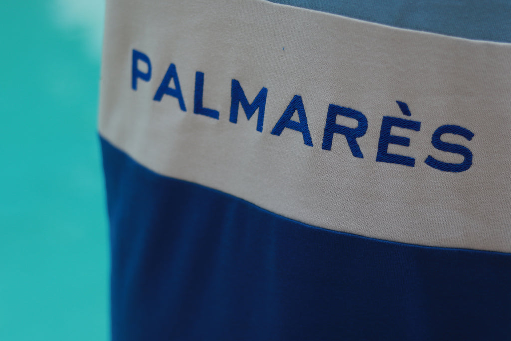 La broderie palmarès de couleur bleu roi sur la bande centrale blanche est réalisée en points chainettes (17000 points) et procure un cachet original à notre maillot RAYMOND.