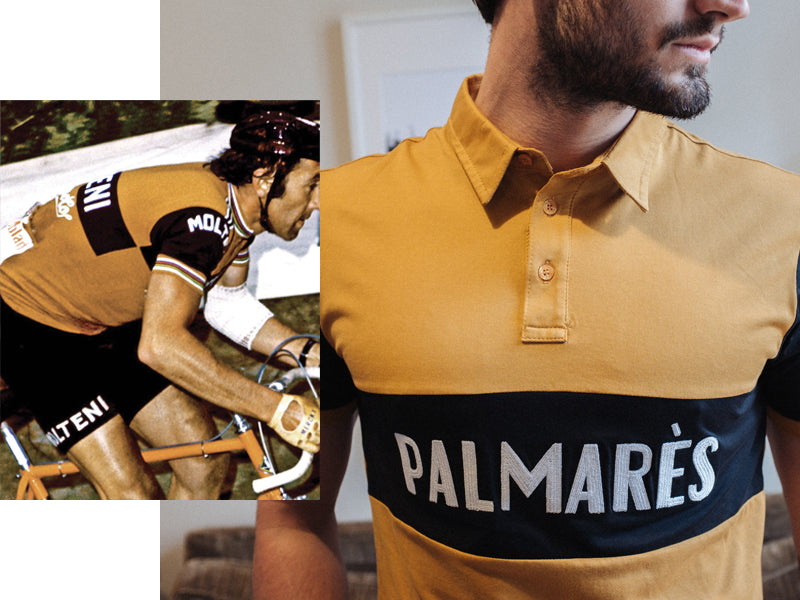 Le polo EDDY s’inspire des vieux maillots de cyclisme des années 1960 à 1980 et notamment du Molteni : maillot de couleur marron camel et cerclé d’une bande noire sur la poitrine où est imprimé le nom du sponsor.