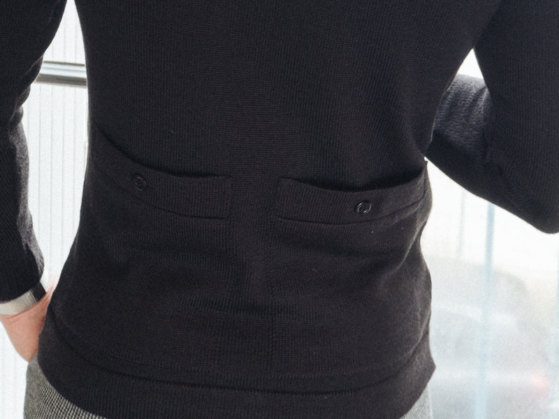 La poche poitrine avec son liseré, ses coutures, son bouton et sa couleur intérieure marron identique au col donne un design original (mode vélo) et permet au pull d’apporter une nouvelle tendance à la mode masculine : la mode " maillots vintage cyclisme ".
